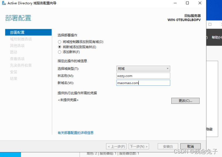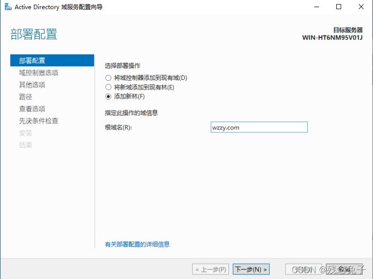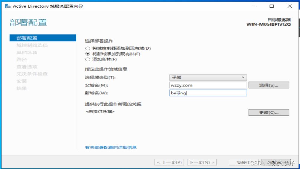 選擇將新域添加到現有林---選擇域類型為樹域---輸入父域名wzzy.com2022-1林的名稱,輸入新的域名 域名隨意
