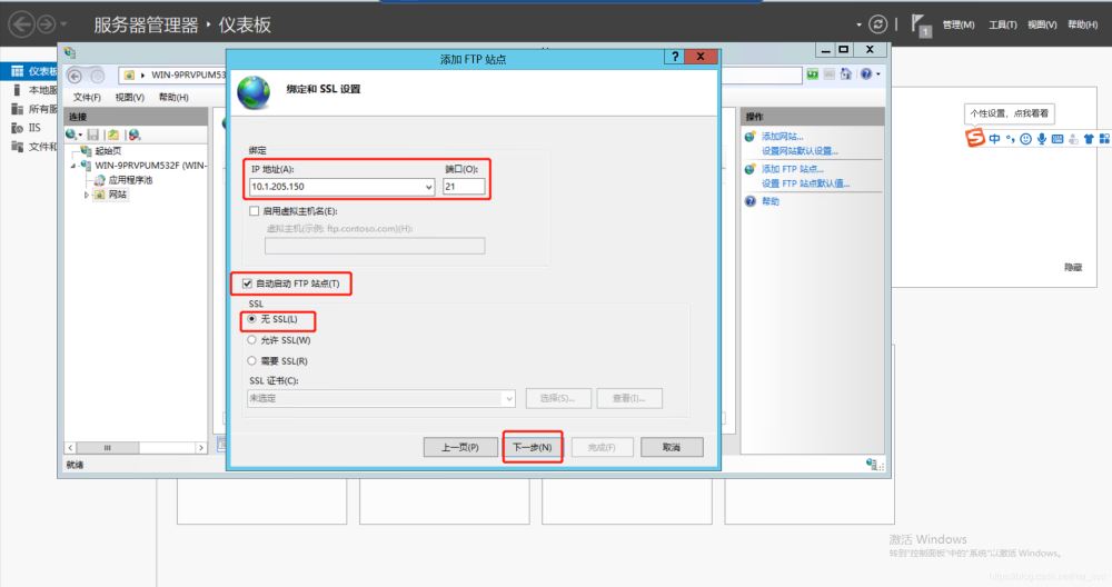 這里需要多說一下:綁定信息的設(shè)置其中包含了,F(xiàn)TP服務(wù)器訪問的地址,F(xiàn)TP服務(wù)器端口號(hào)及開機(jī)自啟動(dòng)和FTP證書配置