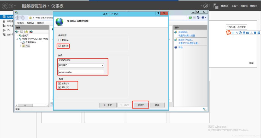 windwos鍵–》服務(wù)器管理器–》工具–》IIS管理器–》擴(kuò)展服務(wù)器(顯示網(wǎng)站并點(diǎn)擊)–》配置ftp站點(diǎn)名稱及物理路徑–》下一步–》選擇綁定IP地址(和無ssl)–》下一步–》身份驗(yàn)證配置–》授權(quán)的用戶–》權(quán)限配置完成