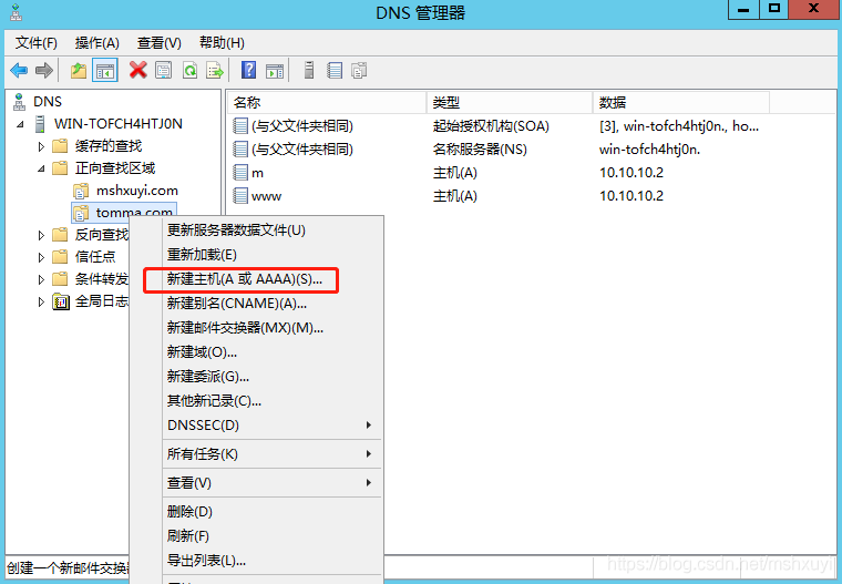完成以后,點開 正向查找區域 → 找到 tomma.com域名右鍵 → 新建主機(A或AAAA)