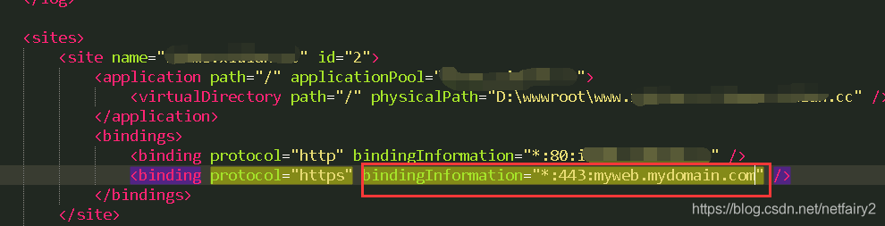 會發現對應的網站域名下面bindingInformation=":443:" 缺少了對應域名,添加上你自己的主機域名保存即可。
