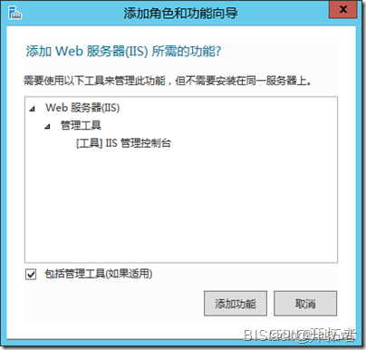 在勾選【W(wǎng)eb服務(wù)器(IIS)】選項時候,可能會彈出如下類似的需要添加其它角色和功能的確認框,點擊【添加功能】即可。