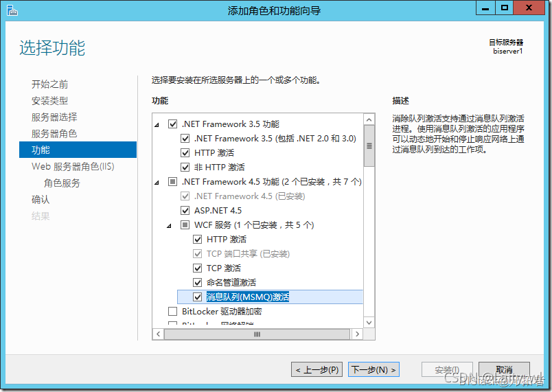 在該界面,將【.NET Framework 3.5功能】、【.NET Framework 4.5功能】下的組件全部勾選上。