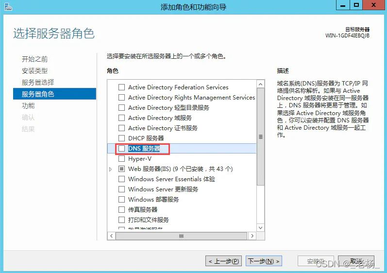 彈出界面一直按默認選項點擊下一步,到選擇服務器角色界面,選擇 “DNS服務器” 點擊下一步,然后一直按默認設置點擊下一步直到安裝完成。