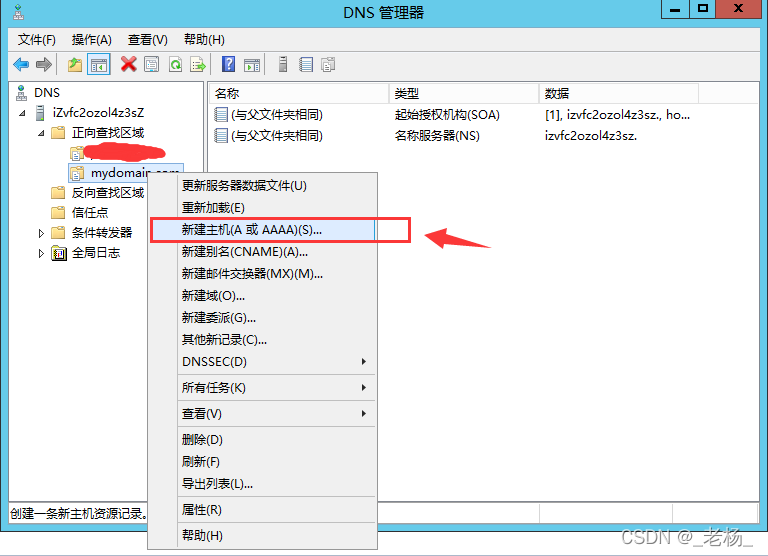 在正向查找區域下選中剛才新建的域名 mydomain.com 右鍵點擊新建主機