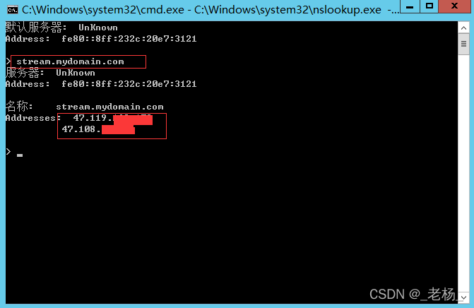 2、在命令窗口中輸入剛才配置的 stream.mydomain.com,可以查找出剛才添加的主機地址。