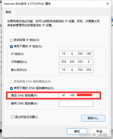 3、使用一臺遠程客戶機,將客戶機的DNS設置為剛才配置DNS服務的Windows Server 的服務器的IP:
