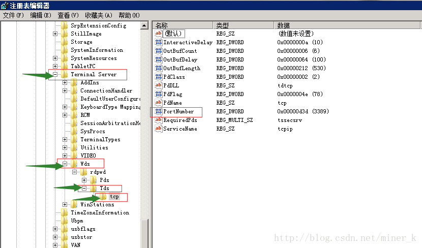 [HKEY_LOCAL_MACHINE\SYSTEM\CurrentControlSet\Control\Tenninal Server\WinStations\RDP-Tcp],將PortNumber的值(默認(rèn)是3389)修改成端口2121