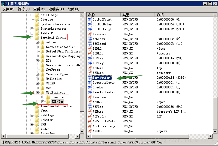 [HKEY_LOCAL_MACHINE\SYSTEM\CurrentControlSet\Control\Terminal Server\Wds\rdpwd\Tds\tcp]其下的”PortNumber”鍵值所對(duì)應(yīng)的就是端口號(hào),此處設(shè)置為2121