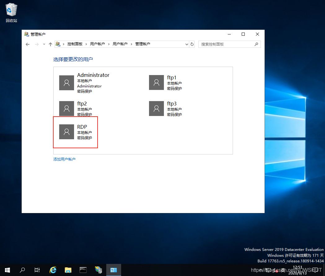 (4)返回【管理賬戶】頁面,可以看到新建的用戶RDP已經出現在用戶列表中。