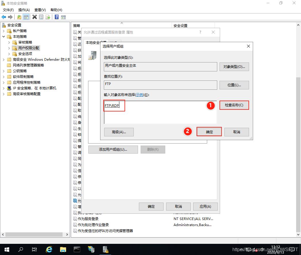 (3)在彈出的【選擇用戶】提示框下方輸入:RDP,然后點擊右側的【檢查名稱】,用戶檢查無誤后,最后點擊【確定】。
