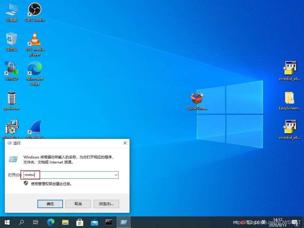 在PC2中,按【WIN】+【R】快捷鍵,在【運行】中輸入:mstsc,點擊確定。