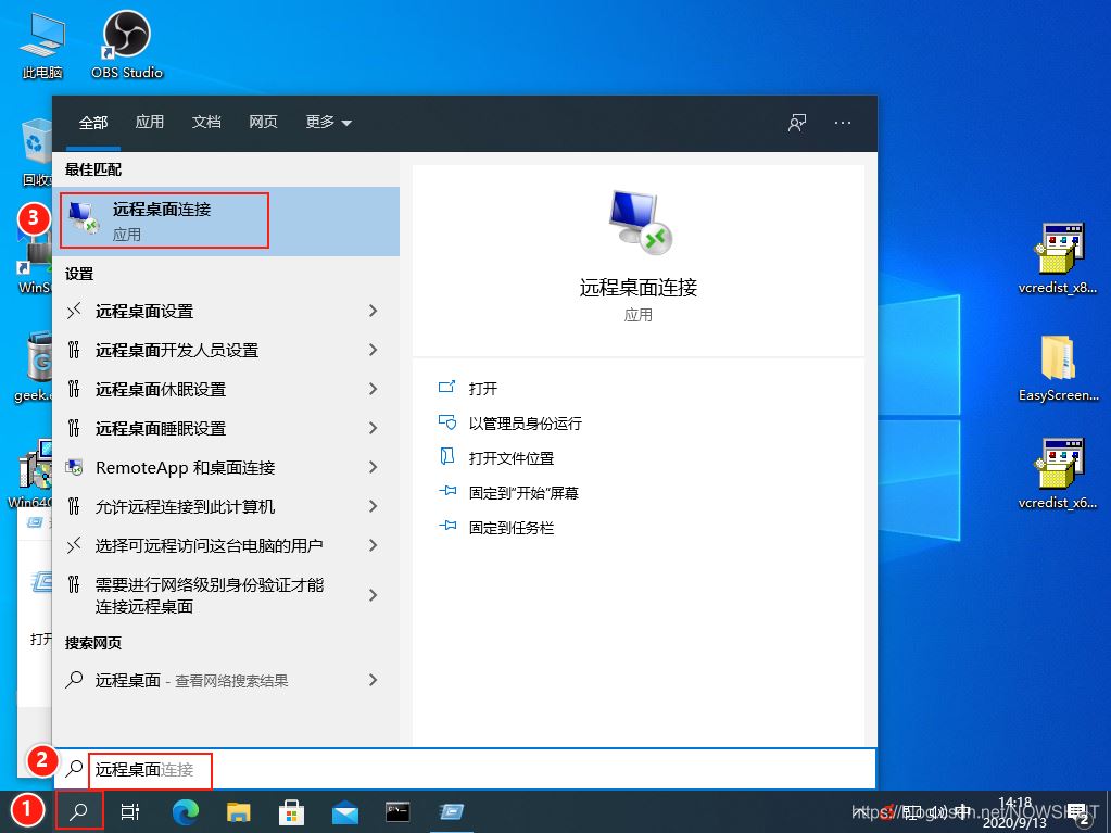 點擊【搜索】圖標,輸入:遠程桌面,在最佳匹配中選擇【遠程桌面連接】。