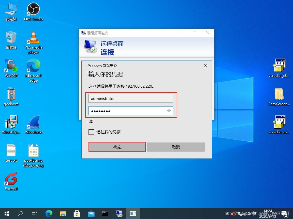 (2)在彈出的【遠程桌面連接】認證窗口中輸入被遠程訪問的計算機的IP地址:192.168.82.220,點擊【連接】。