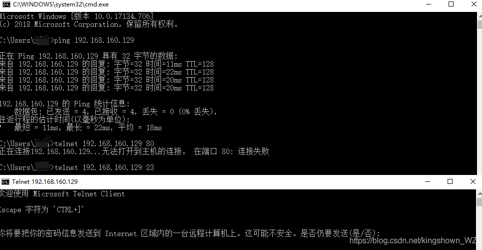 (2)網絡正常時Telnet IP發起遠程訪問主機。
