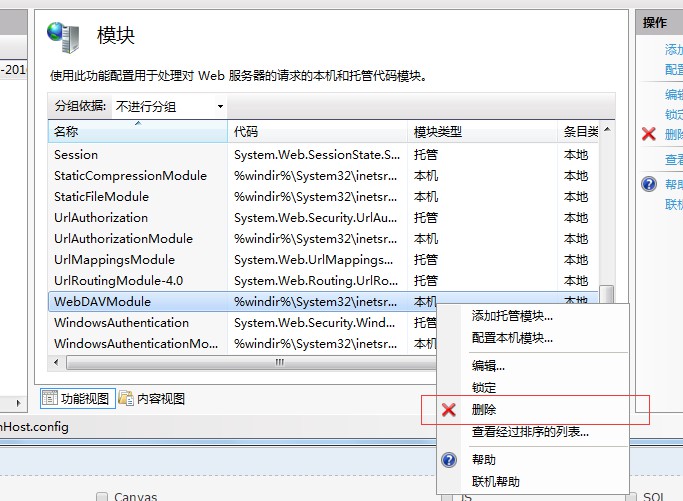 如果還是不可以,請手動刪除IIS中的WebDav模塊,如下圖:
