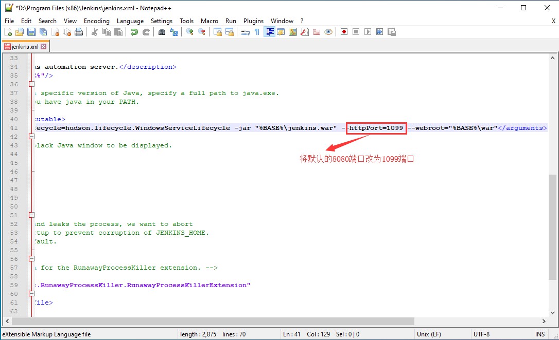 找到Jenkins安裝目錄下面的jenkins.xml文件,將httpPost=8080修改為要修改的端口號