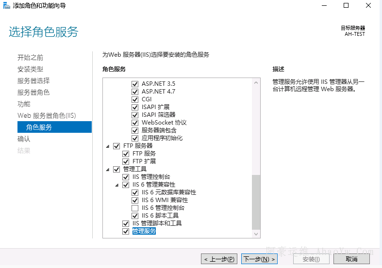 10.6、勾選FTP服務器(打開FTP功能)和管理工具如下,勾選完上述如下功能后繼續點擊下一步