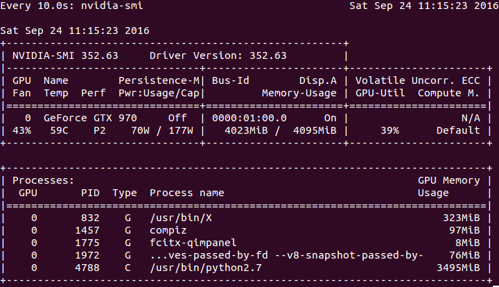Nvidia自帶了一個nvidia-smi的命令行工具,會顯示顯存使用情況: