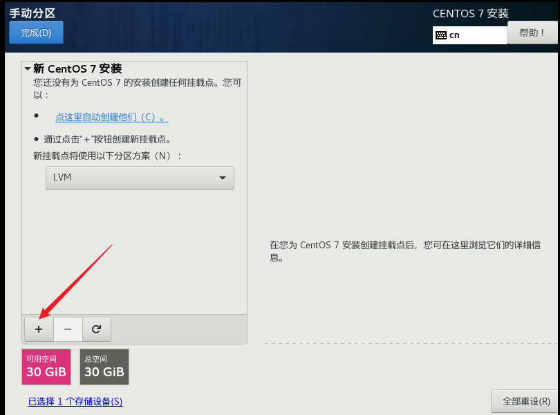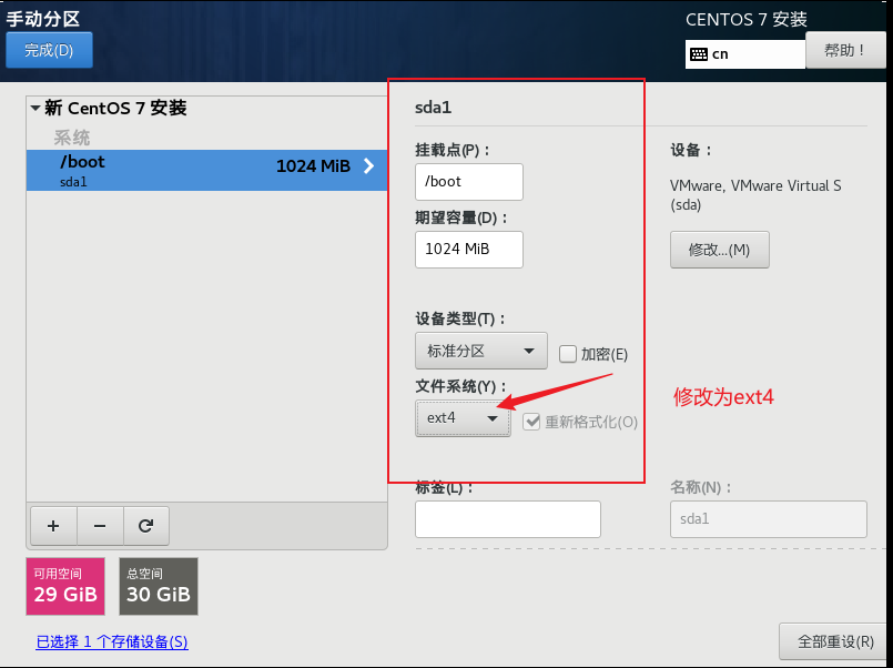指定/boot 分區,即引導分區,大小為1G, 然后點擊添加掛載點.