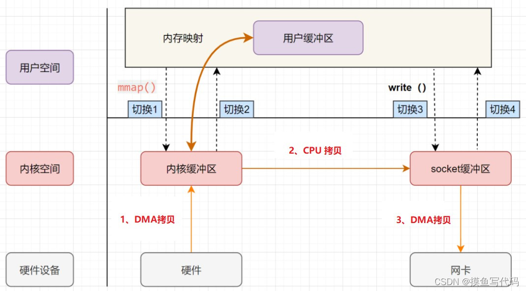 mmap + write 流程如圖所示,發生了4次切換 + 2次DMA拷貝 + 1次CPU拷貝
