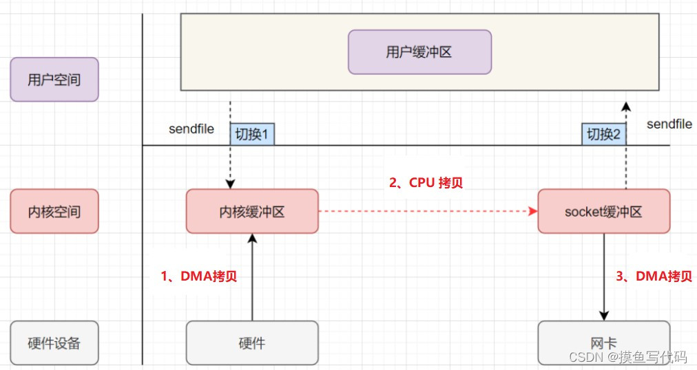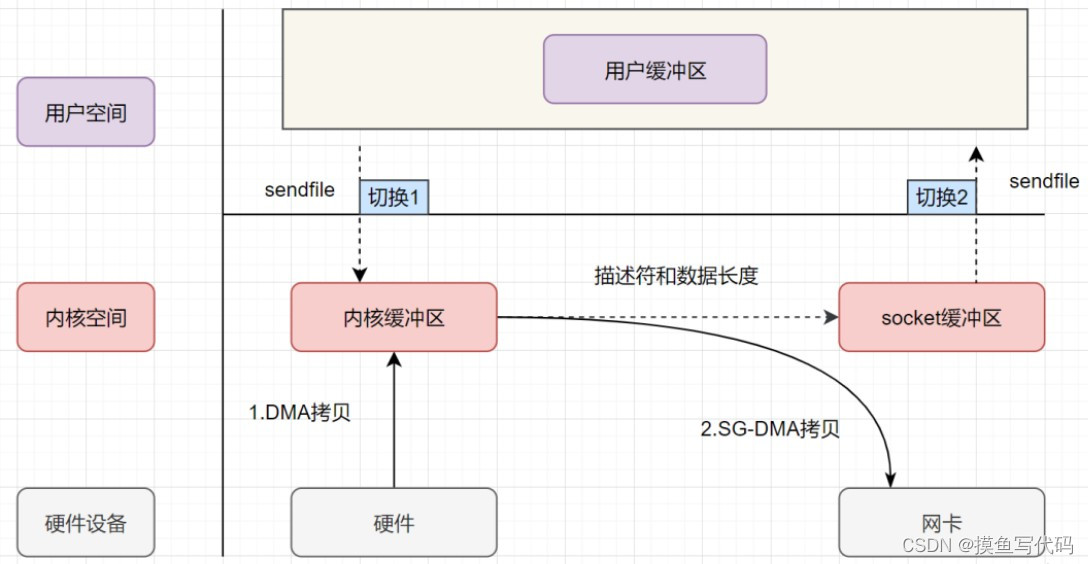 如圖所示,sendfile + DMA 的過程中發生了2次切換 + 2次DMA拷貝 + 0次CPU拷貝