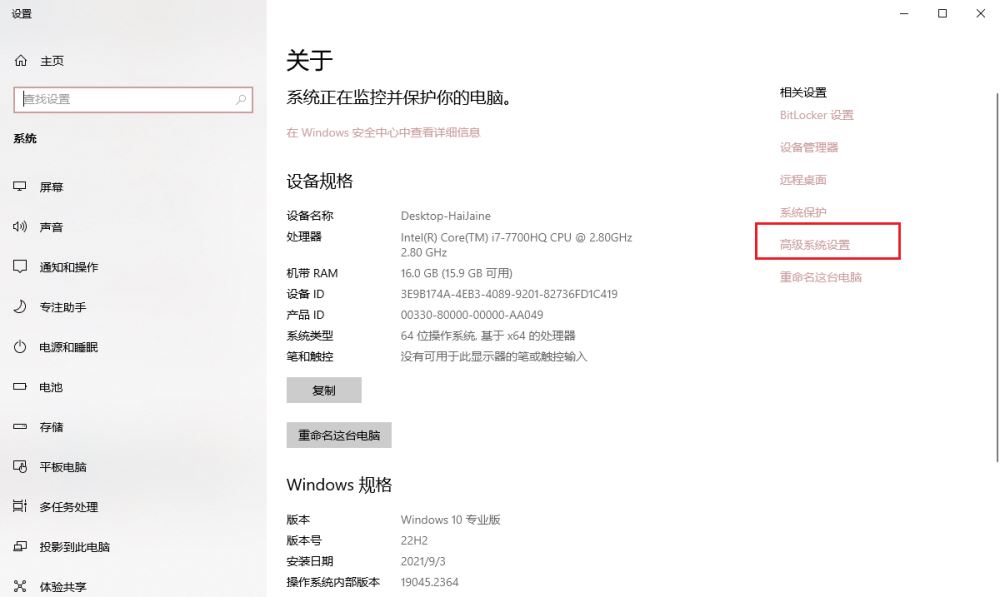 在這個界面中,需要點擊高級系統設置。(我這邊使用的系統版本比較新,這里顯示的界面和以前的win10有所不同,以前版本的win10這個界面的高級系統設置應該是在左上角部分)