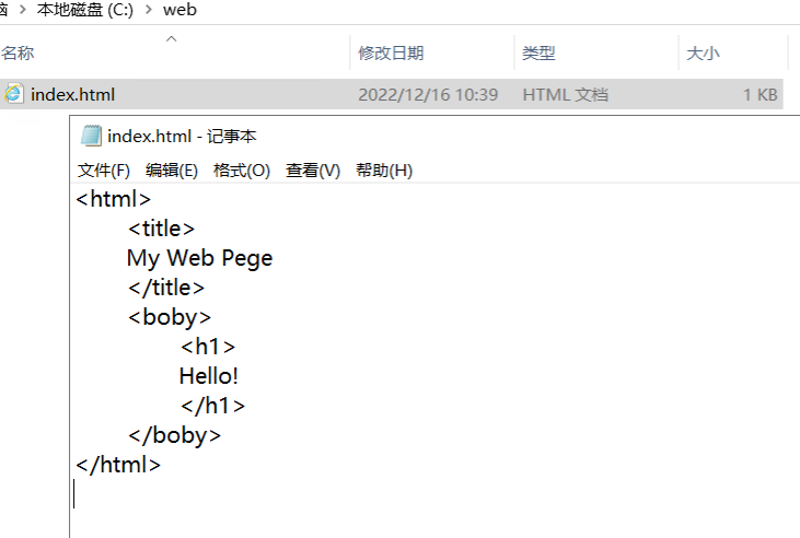 <html><title>My Web Pege</title><boby><h1>Hello!</h1></boby></html>