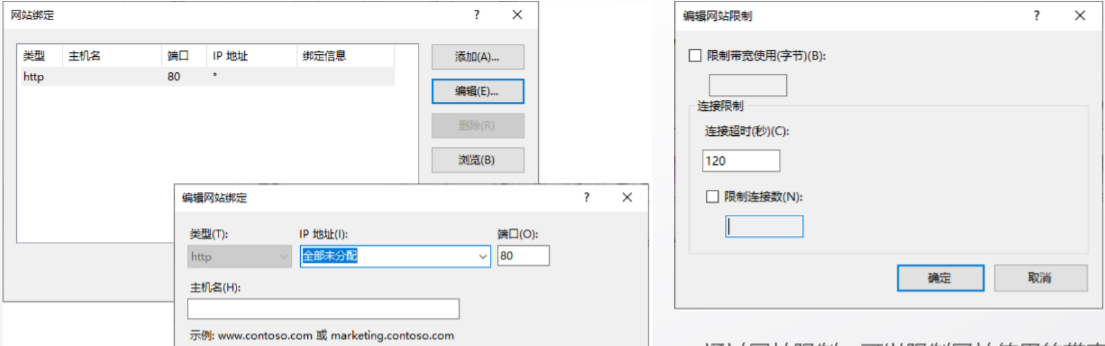 網(wǎng)站創(chuàng)建好后,仍可以對其設(shè)置進(jìn)行更改,如:更改綁定與配置限制策略等