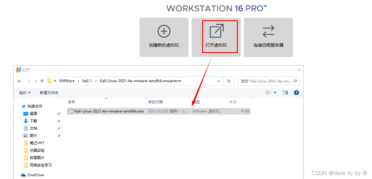 (4)打開VMware16,選擇“打開虛擬機”→選擇剛剛解壓的路徑→選中該文件→打開。