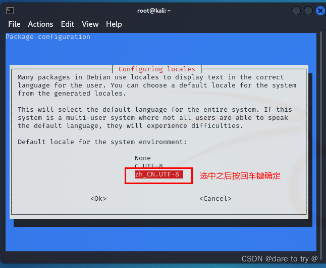 (6)按回車完成配置,出現以下界面,按↓鍵,選中zh-CN.UTF-8,回車確定。