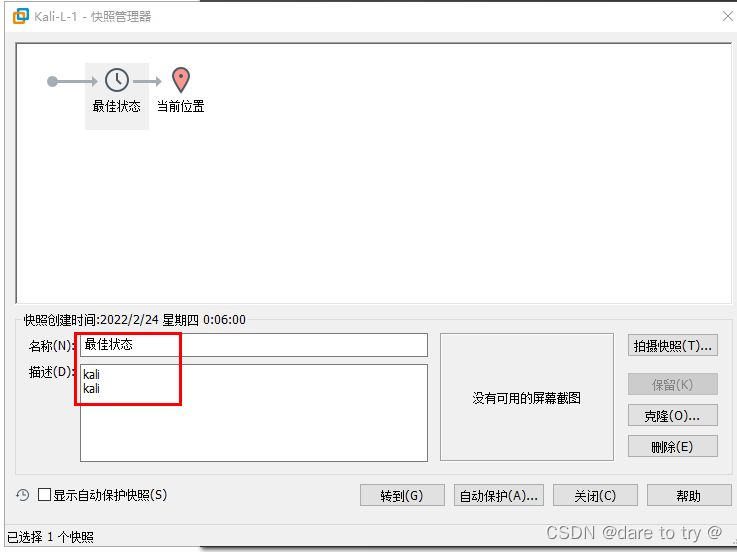 為該系統設置快照,方便以后進行快速還原。首先關機,然后按下圖順序點擊創建快照,將此版本命名為最佳狀態,同時寫上備注,如完成系統安裝的初始狀態,kali用戶及密碼為等。