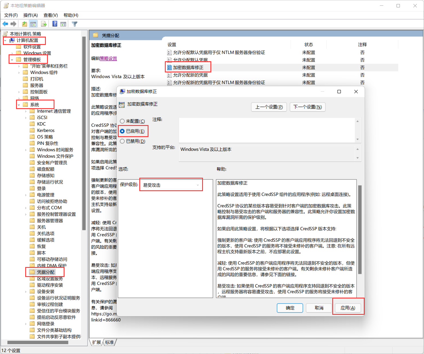 依次打開:計算機配置-管理模板-系統(tǒng)-憑據(jù)分配-加密數(shù)據(jù)庫修正(雙擊打開)