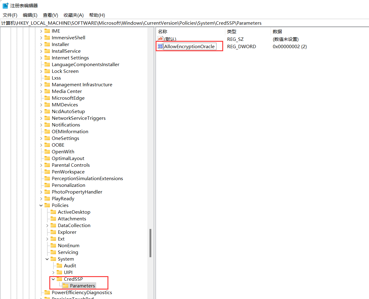 最后新建值:類型為DWORD(32位),名稱為AllowEncryptionOracle,值為2