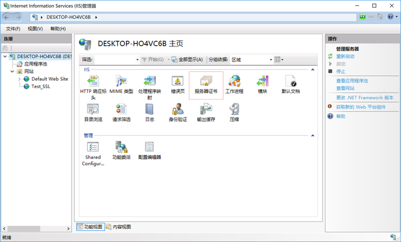 4.在主頁的IIS部分中,雙擊“服務器證書”