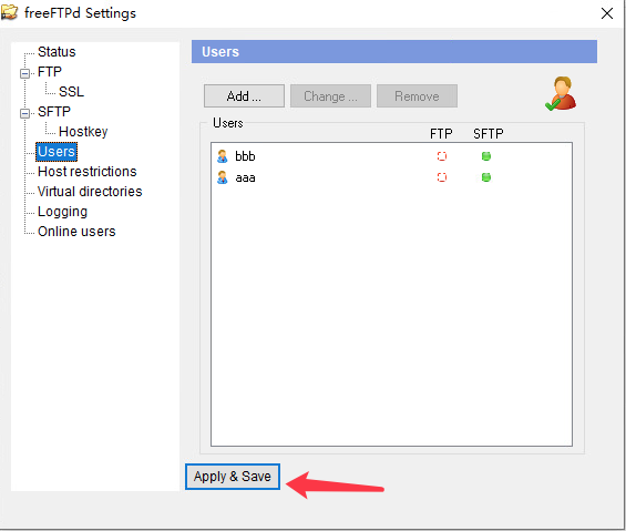 以管理員權限打開freeFTPd,如果以普通用戶打開freeFTPd,將無法保存配置。