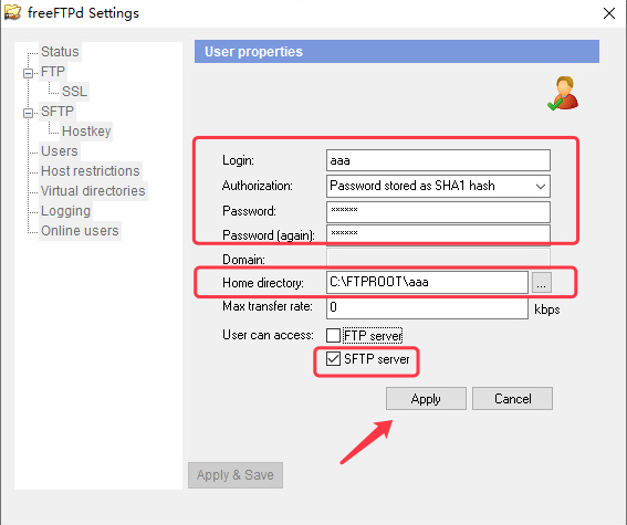 Apply按鈕保存。 - 以及別忘了配置SFTP根目錄文件夾的目錄權限.