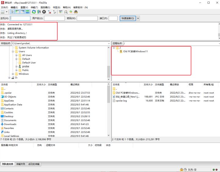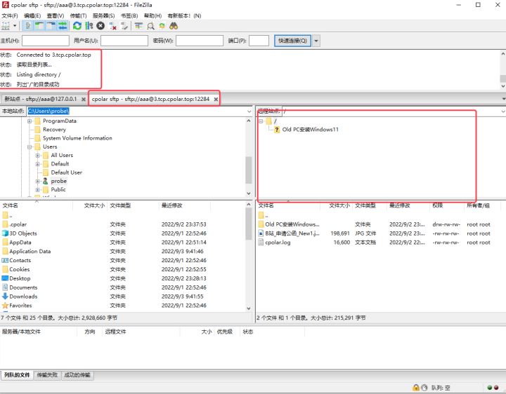 可以看到,已經通過cpolar提供的公網域名,連接SFTP服務器成功。