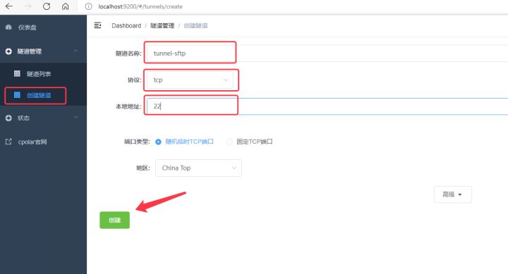 選擇左側儀表盤的隧道管理–創建隧道,我們來創建一個新隧道,指向22端口,tcp協議: