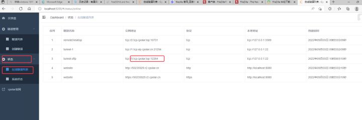 點擊左側儀表盤的狀態——在線隧道列表,可以看到本地所有在線隧道的公網地址。可以看到我們剛剛所創建的SFTP隧道的公網地址為 3.tcp.cpolar.top:12284,其中3.tcp.cpolar.top是公網地址,12284是端口號。