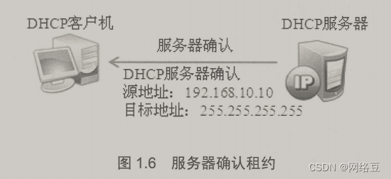 DHCP服務器接收到DHCP Request消息后,以DHCP ACX消息的形式向客戶機廣播成功確認。該消息包含有P地址的有效租約和其他可配置的信息,雖然服務器確認了客戶機的租約請求,但是客戶機還沒有接收到服務器的DHCP ACK消息。當客戶機收到DHCP ACK消息時。它就配置了IP地址。完成TCP/P的初始化.如圖1.6所示。
