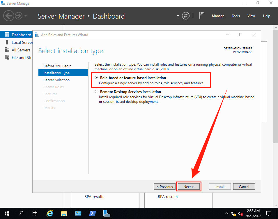 (3)進入【Select installation type】 界面, 使用默認選項【Role-based or feature-based installation】。