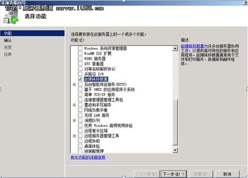 下面就開始在兩個節點上安裝群集服務。在此以server1為例,安裝方法是:打開服務器管理器圖標----添加功能,從中選擇“故障轉移群集”。