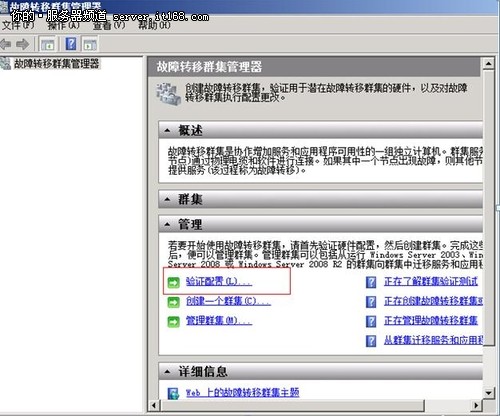 方法是在server1或者是server2上進入故障轉移群集管理器,單擊“驗證配置”。如下圖所示: