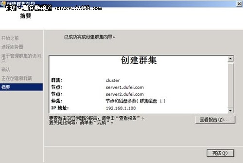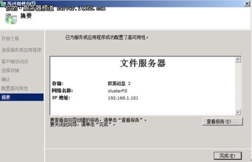 選擇分配給文件服務器的存儲磁盤,在此,除了仲裁就是群集磁盤2了,如上圖所示。出現確認信息后,開始進行配置,出現下圖,表示配置結束。