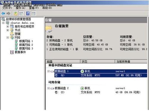 返回到“故障轉移群集管理器”,查看群集的工作狀態,可以看到,仲裁磁盤是我們前面所創建的quorum磁盤,如下圖所示: