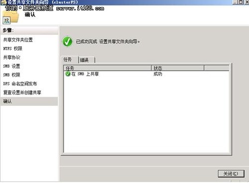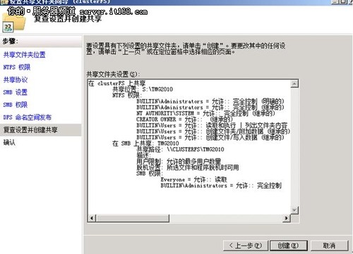 下面根據需要,依次進行SMB設置、SMB權限設置、DFS命名空間發布等,我們在此都使用默認值,然后需要對該設置進行復查,下圖所示: