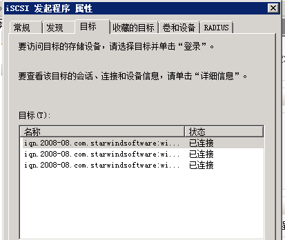 (三):用starwind創建虛擬存儲。在兩個節點,中分別通過ISCSI發起工具,連接到虛擬磁盤。添加到各自節點的磁盤管理器中。并且都裝上文件服務功能。