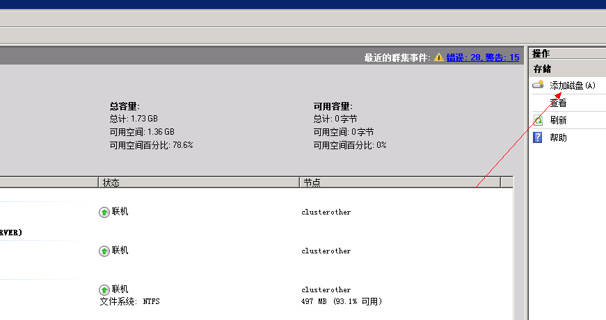 然后對其進行格式化。然后在群集管理器中存儲子項頁上選擇添加磁盤。