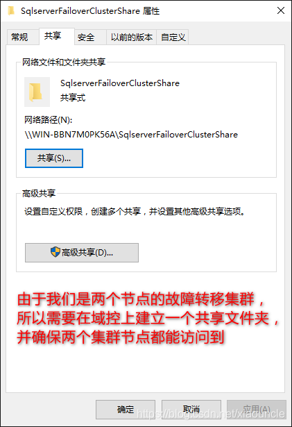 1、因為我們的集群中只有2個節點所以需要創建一個共享文件夾,本例中我們將其放在域控服務器